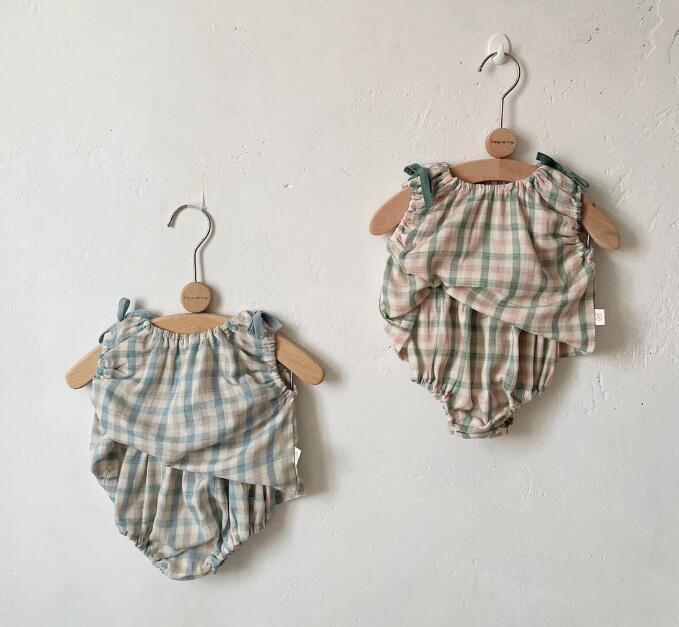 【66-100】 大人気チェックリボンセットアップ(セットアップ 夏新作 ベビー服 子供服 ブラウス 花柄 ロンパース)