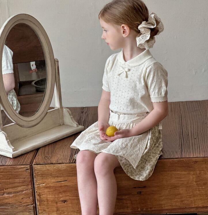 シンプルなサマーニットトップス、襟とリボンが女の子らしさをぐっと引き立てる可愛らしい
