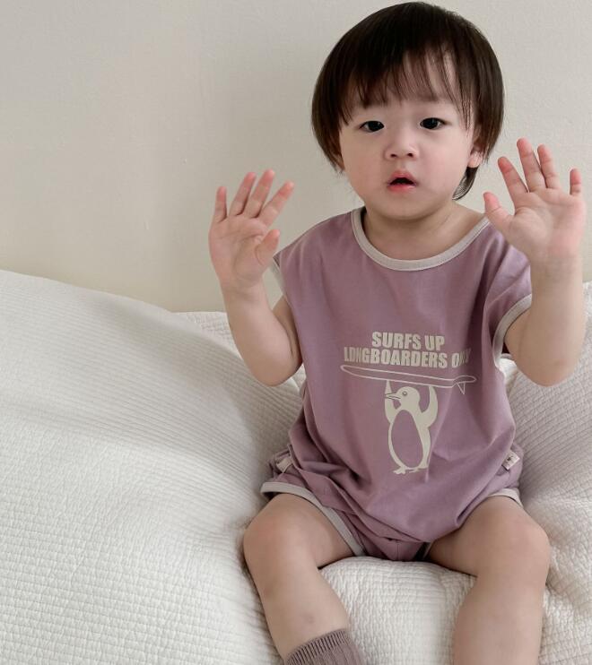 【66-100】 ペンギンセットアップ(セットアップ 夏新作 ベビー服 子供服 ブラウス 男の子 ロンパース)