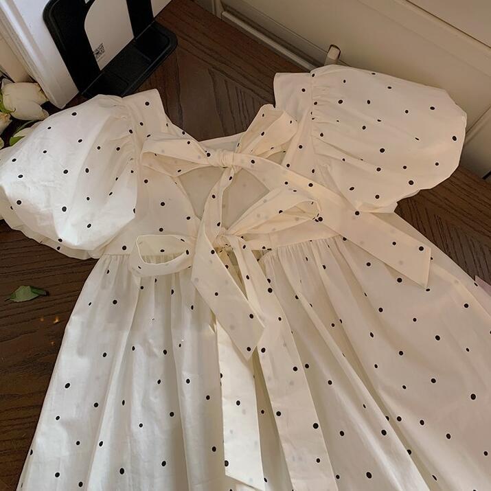 ふんわりとしたパフスリーブとリボンがポイントの、ドット柄キッズワンピース❕