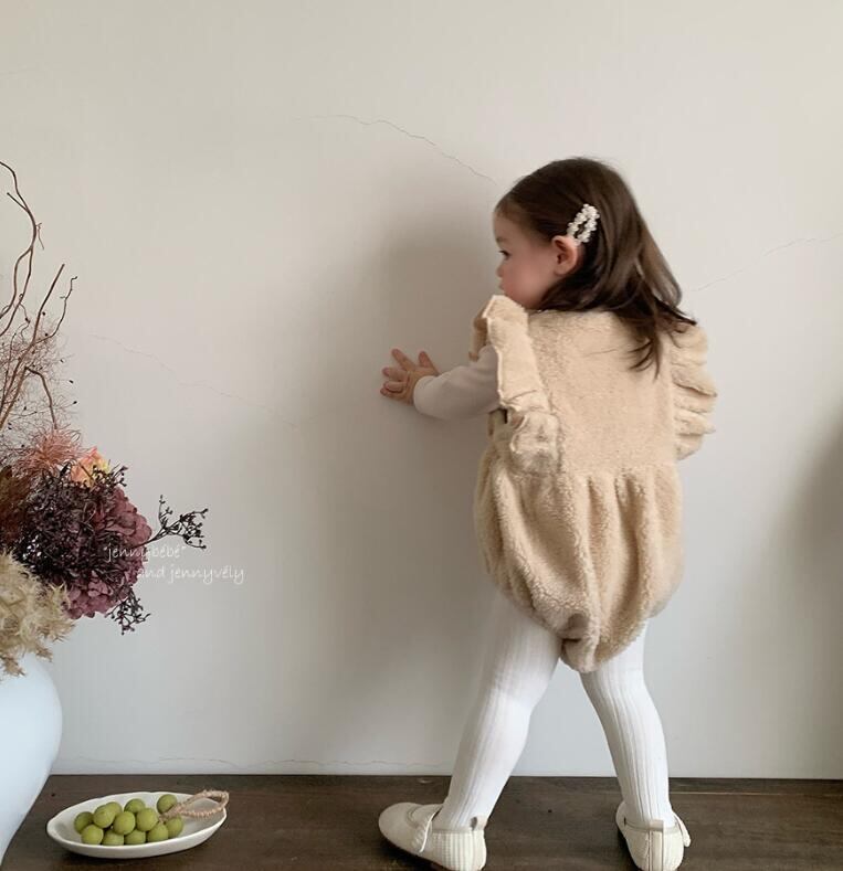 【即納/一部予約】 モコモコボアフリルロンパース (baby 70cm 80cm 2色 かわいい 女の子 モコモコ サロペット ロンパース お出かけ カフェ 冬服 秋服 もこもこ ベスト)